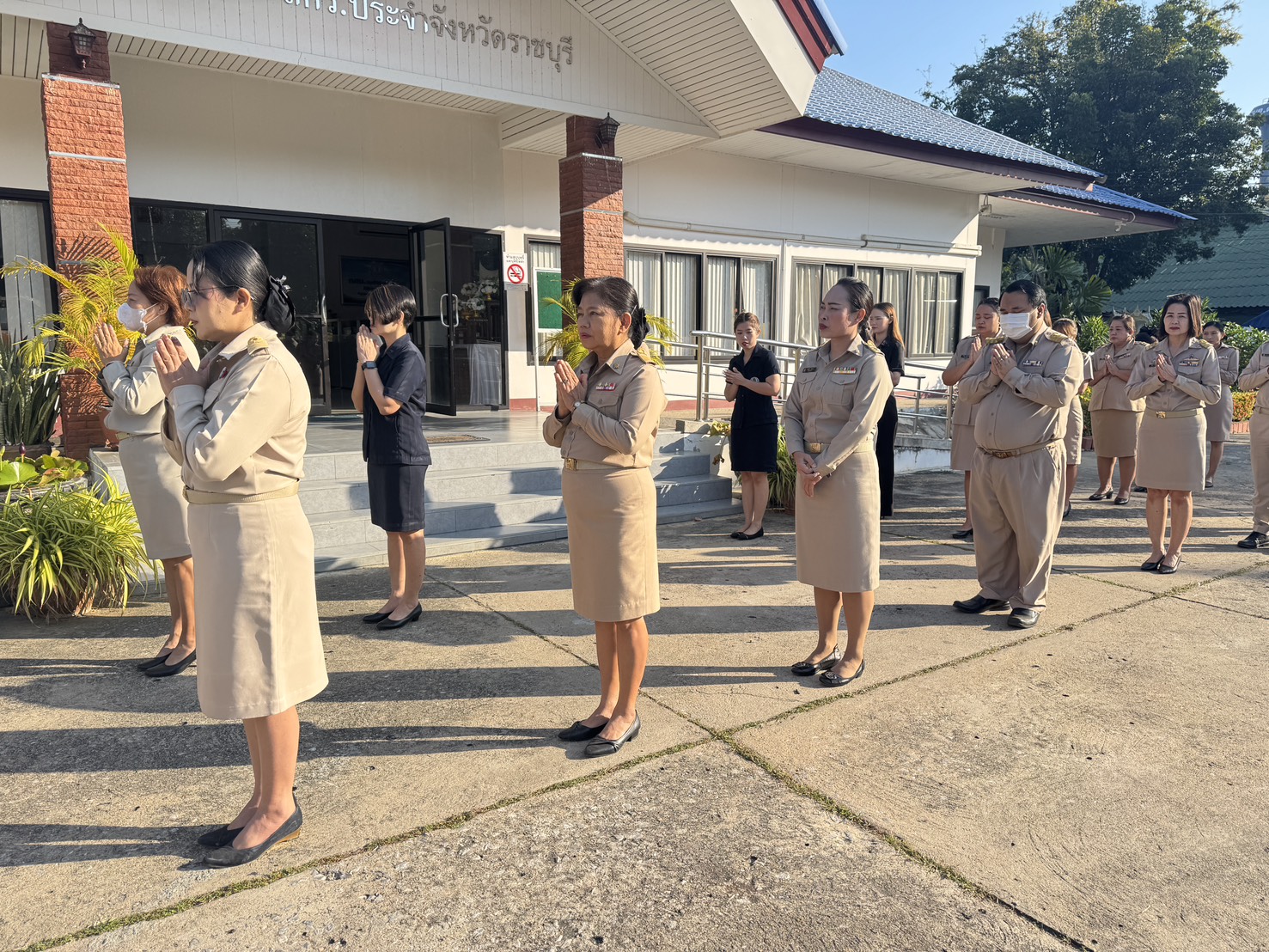 อำนวยการสำนักงานส่งเสริมการเรียนรู้ประจำจังหวัดราชบุรี นำข้าราชการและบุคลากร ผู้ปฏิบัติงาน สำนักงาน สกร.ประจำจังหวัดราชบุรีเข้าร่วมกิจกรรมเข้าแถวเคารพธงชาติ สวดมนต์ไหว้พระ